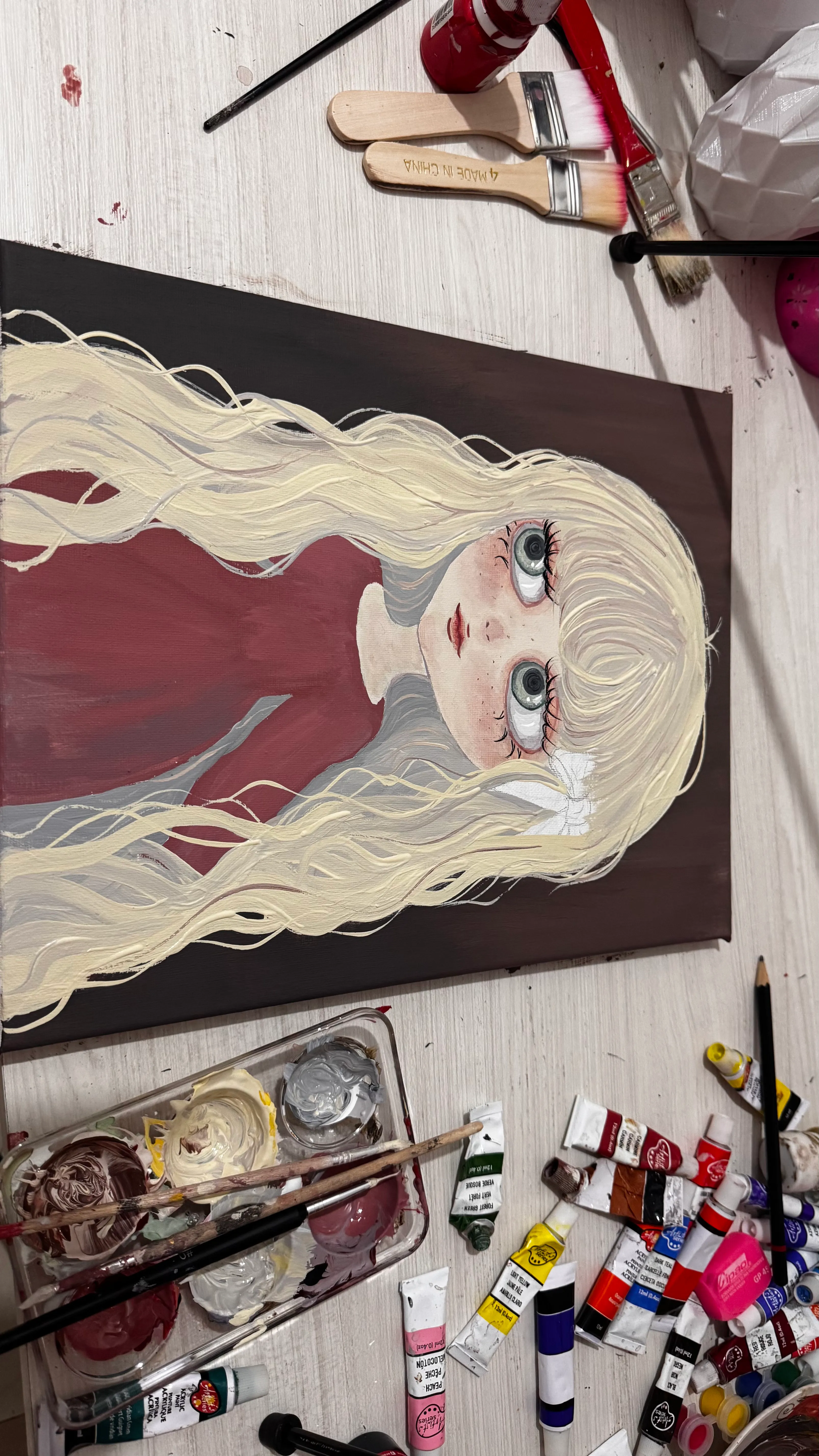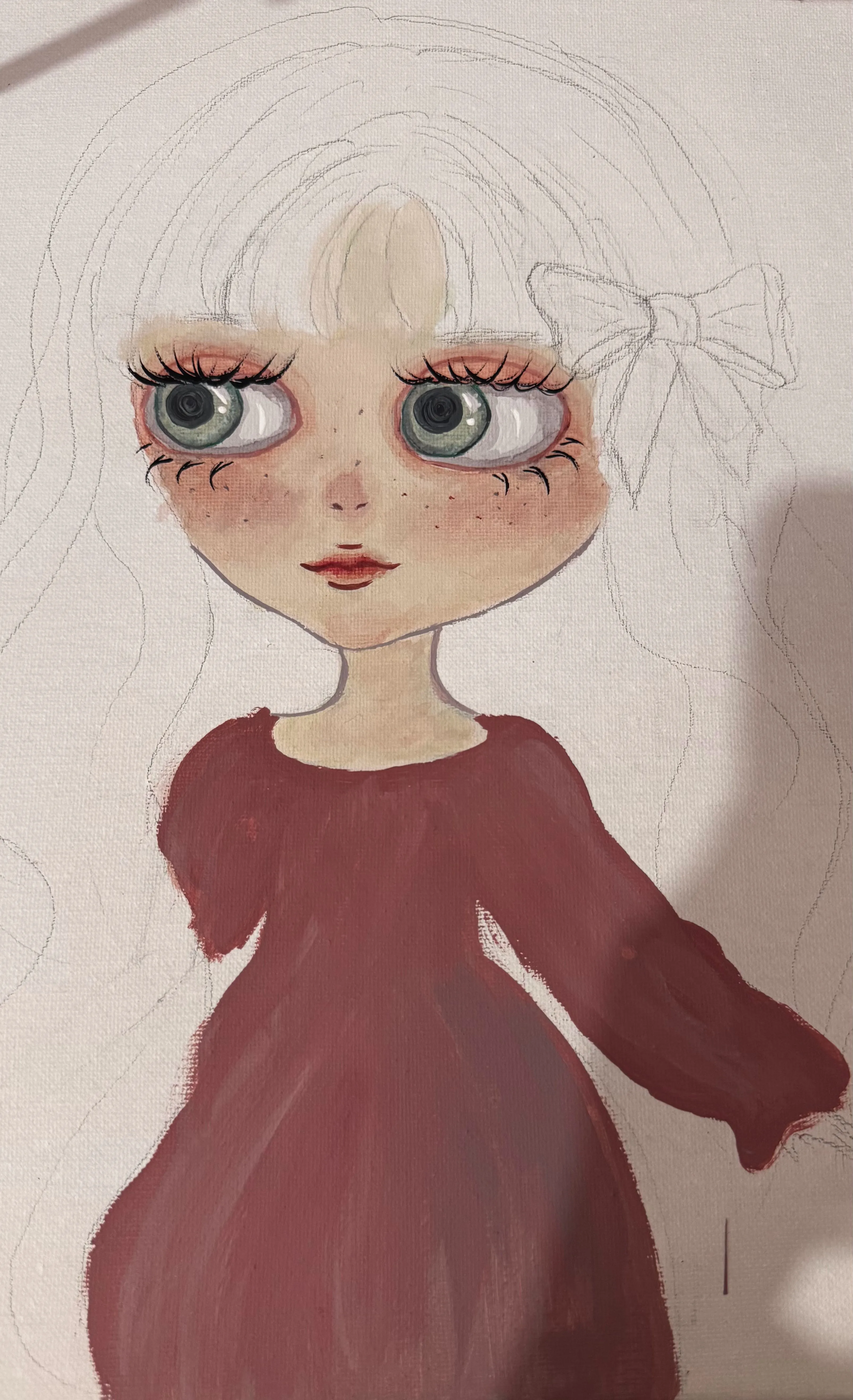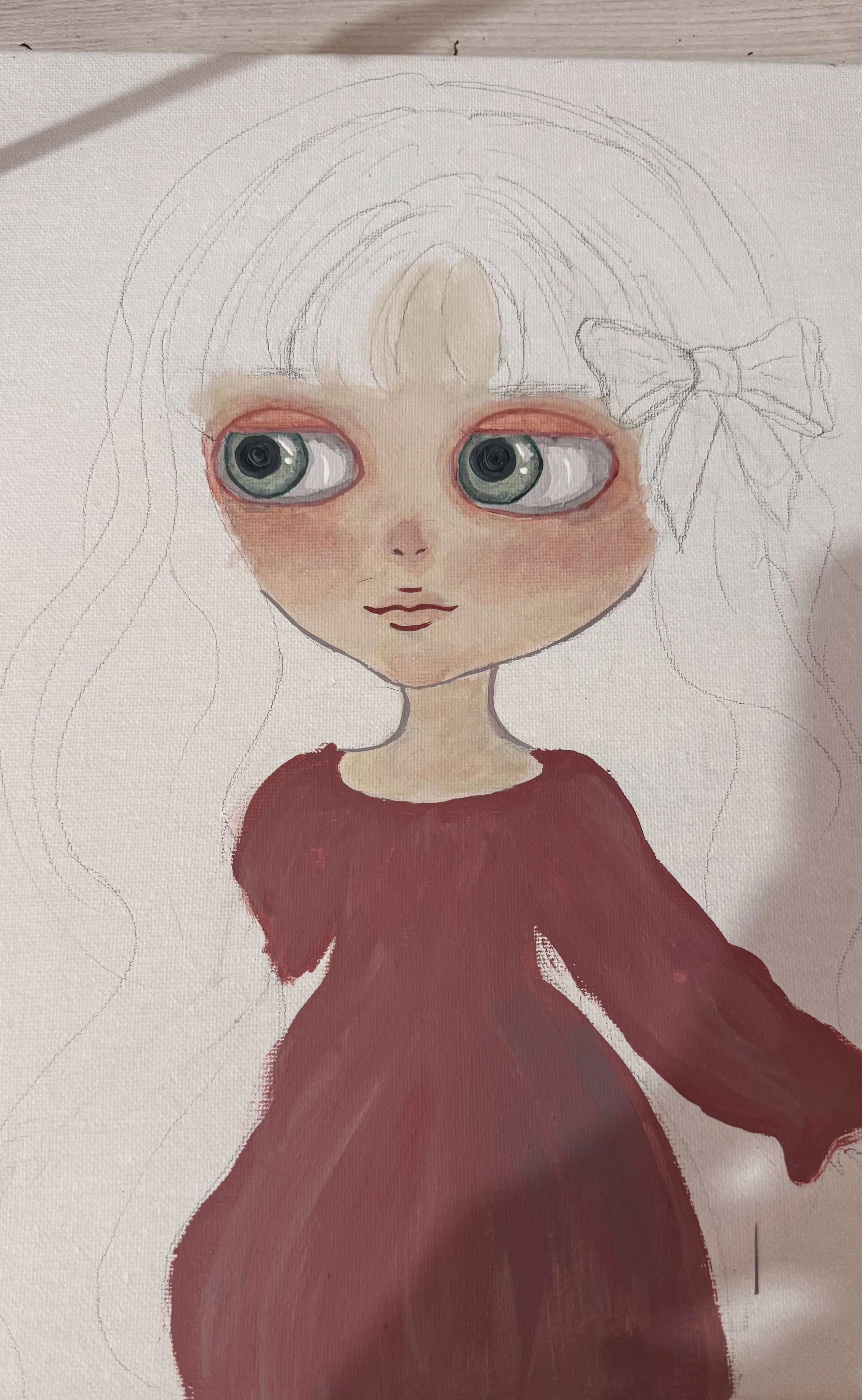 Esta es una pintura original inspirada en una Blythe Dollfie, una muñequita conocida por su gran cabeza, cuerpo pequeño y delgado, y unos ojos inmensos y expresivos. A veces puede parecer inquietante, pero en realidad es una pequeña adoración. Su vestimenta es dulce y delicada, y su mirada parece contener una historia muda.