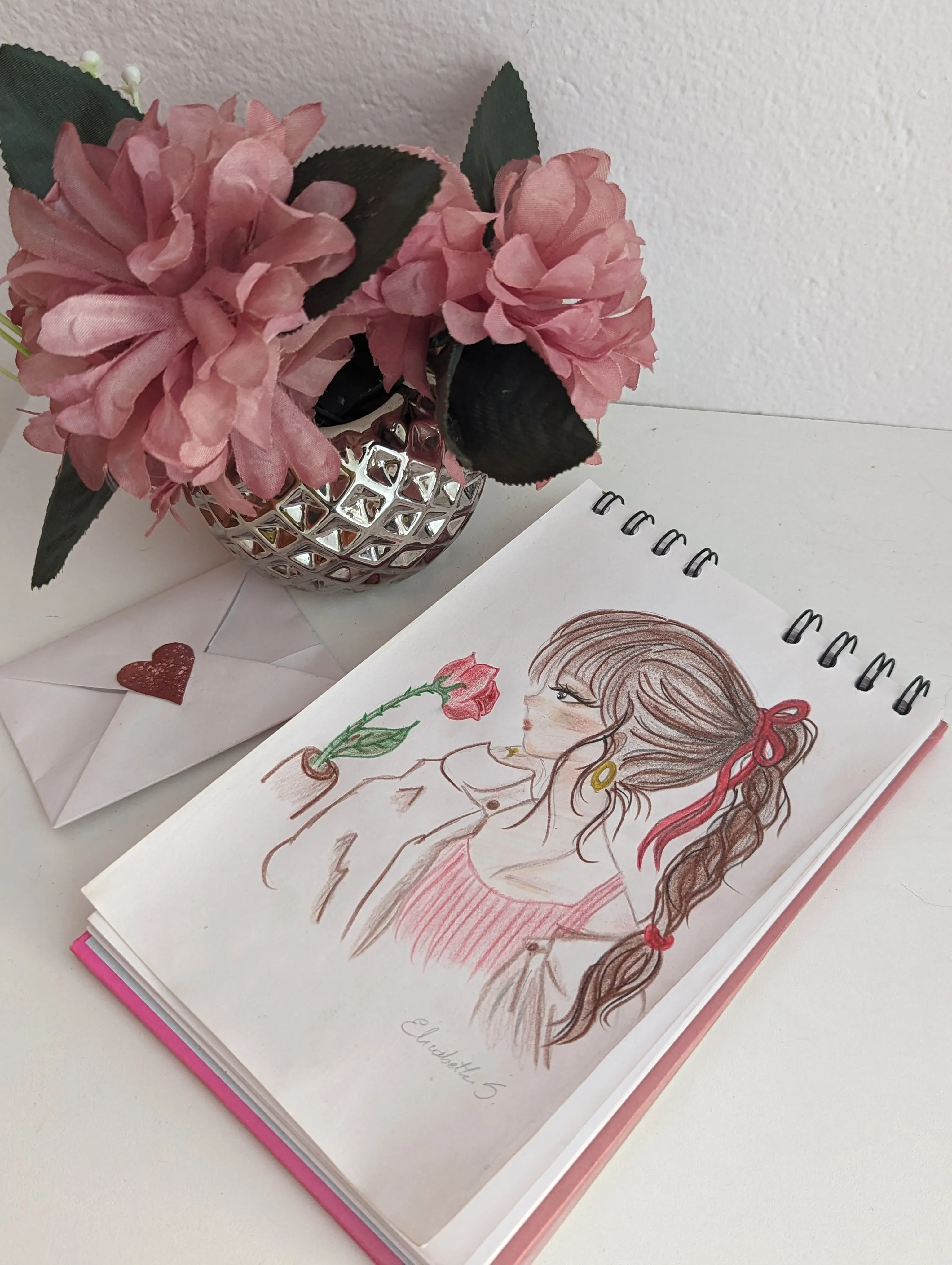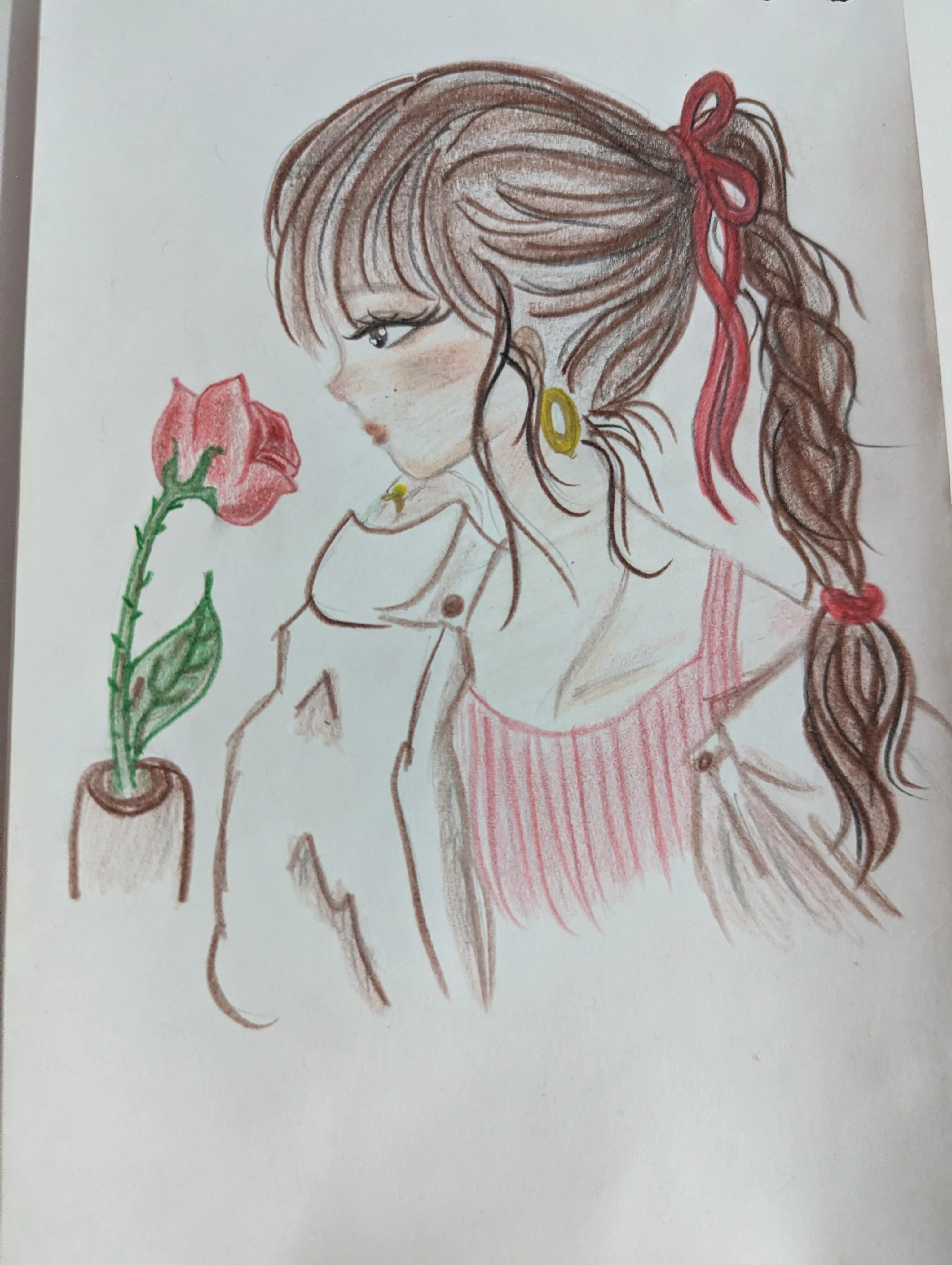 Representa a una chica observando una rosa, capturando un momento tranquilo lleno de contemplación, dulzura y melancolía.
