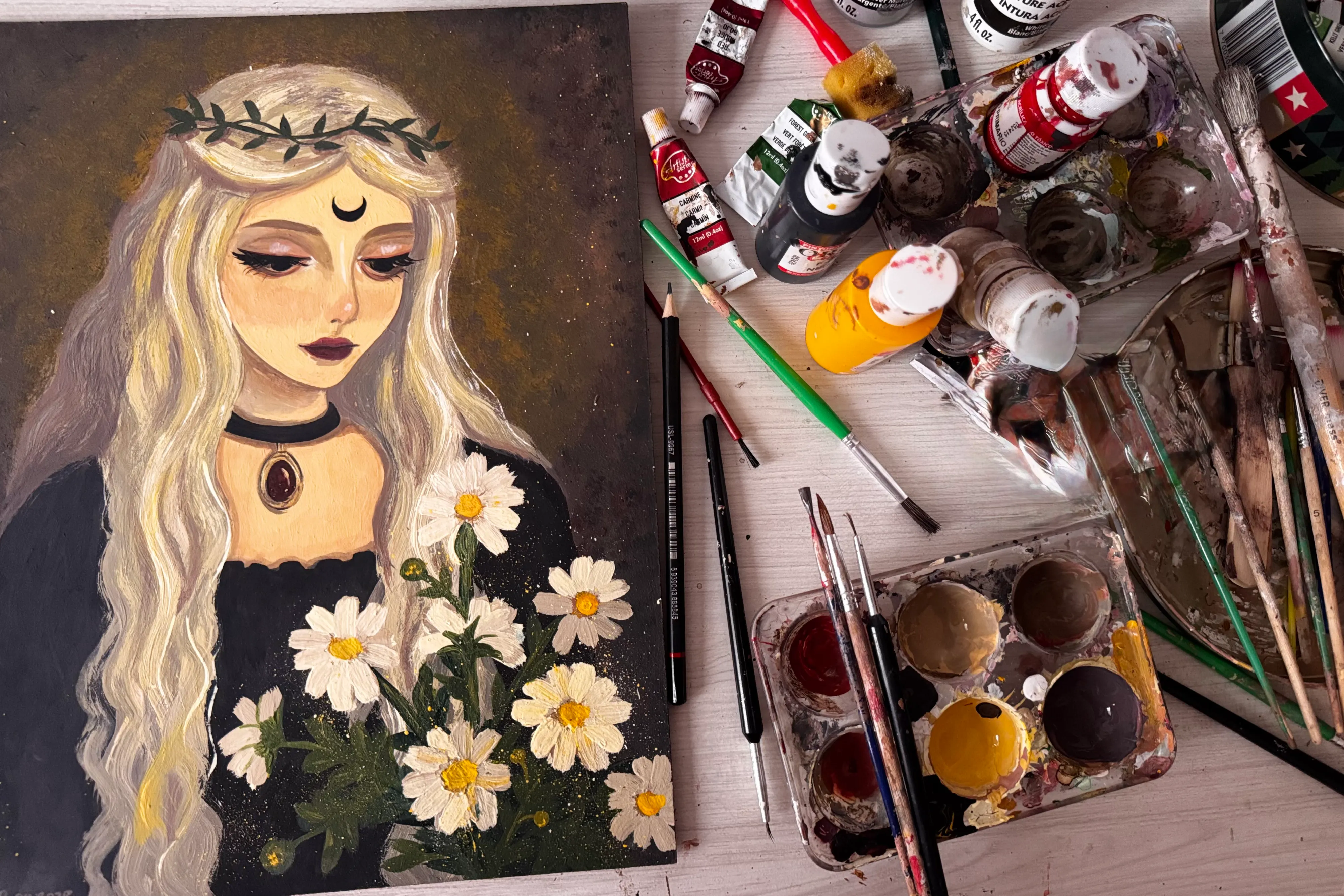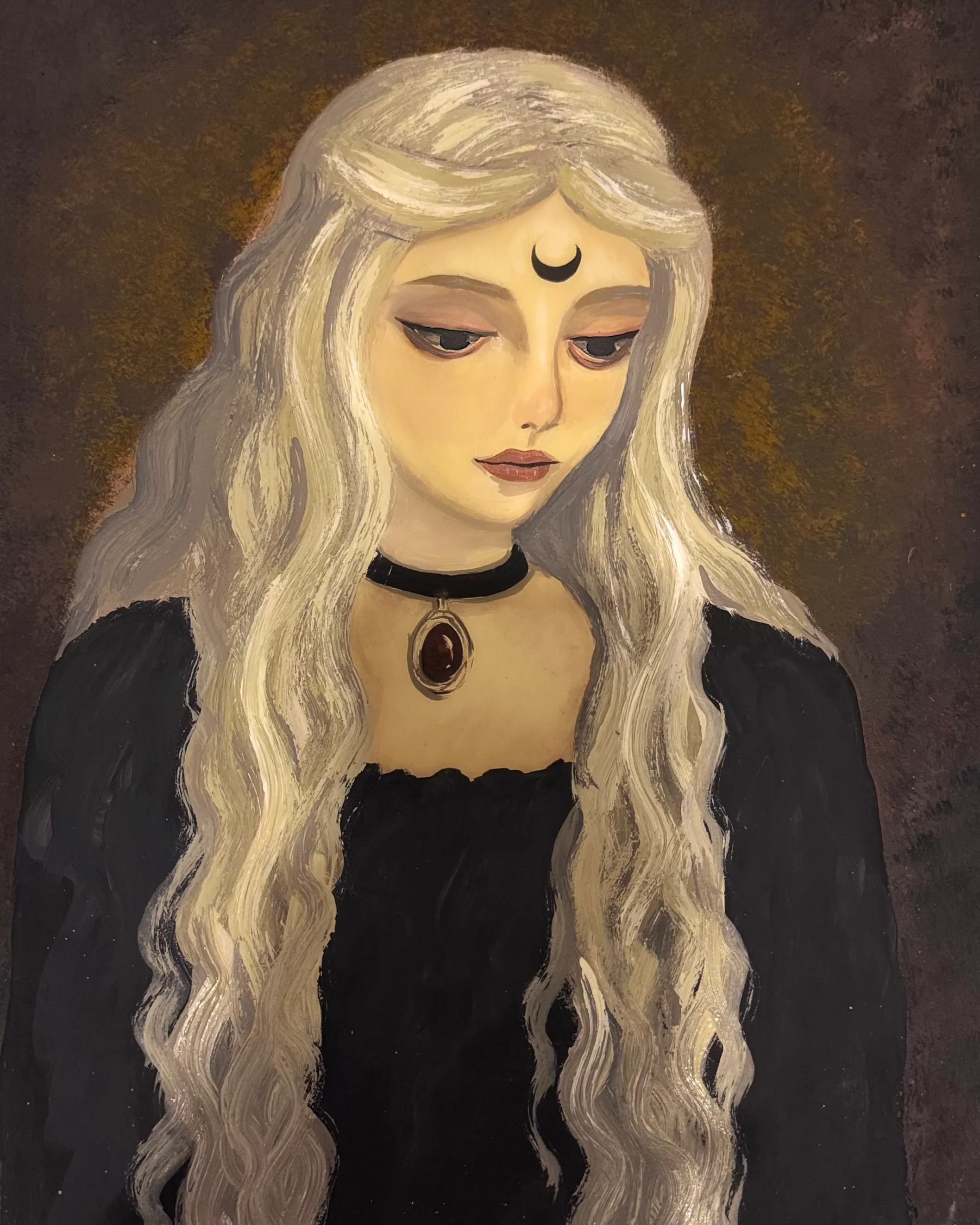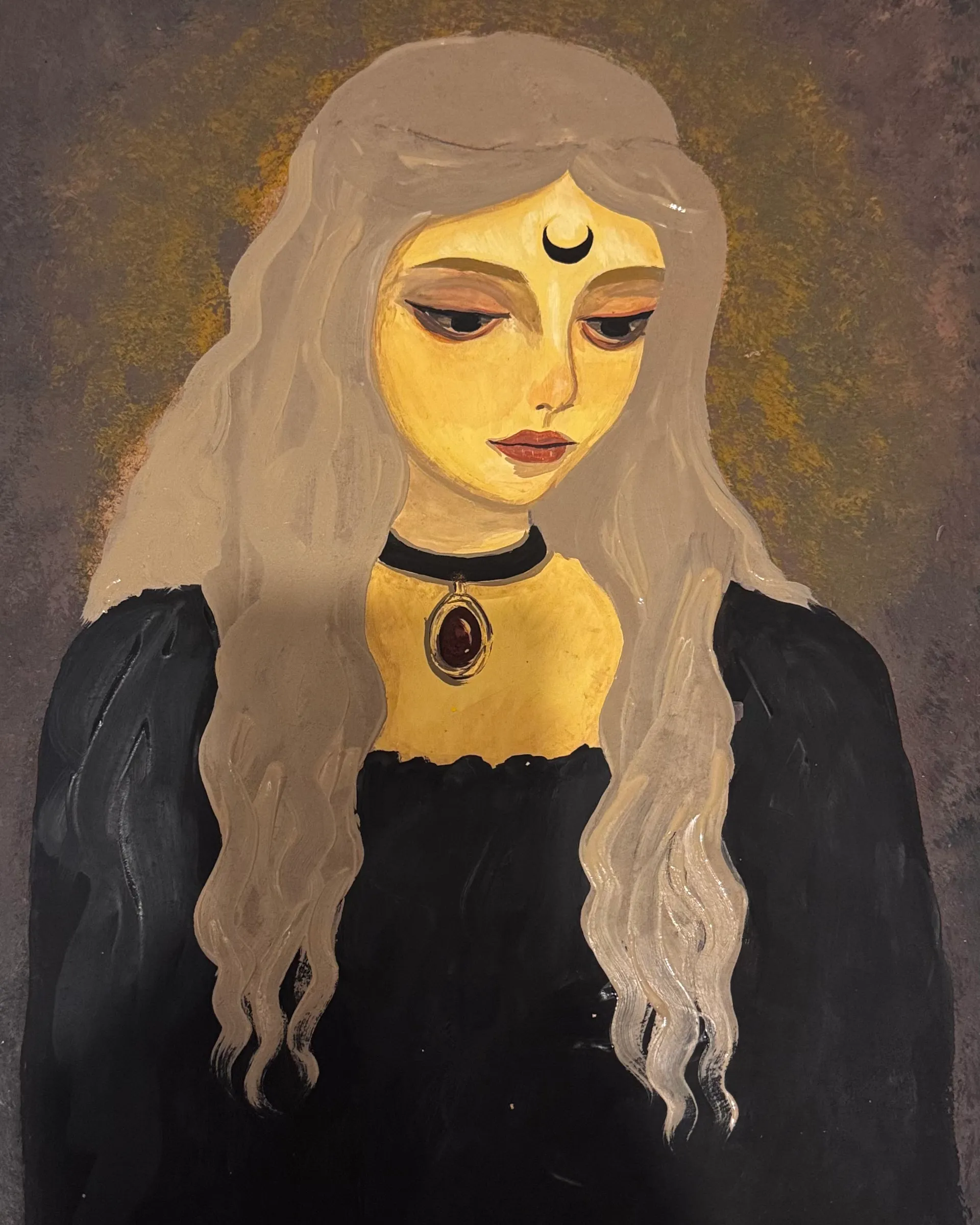 Es una pintura original en acrílico sobre lienzo, utilicé distintos pinceles para construir una figura que habita el silencio, envuelta en una atmósfera vintage, introspectiva y delicadamente oscura.