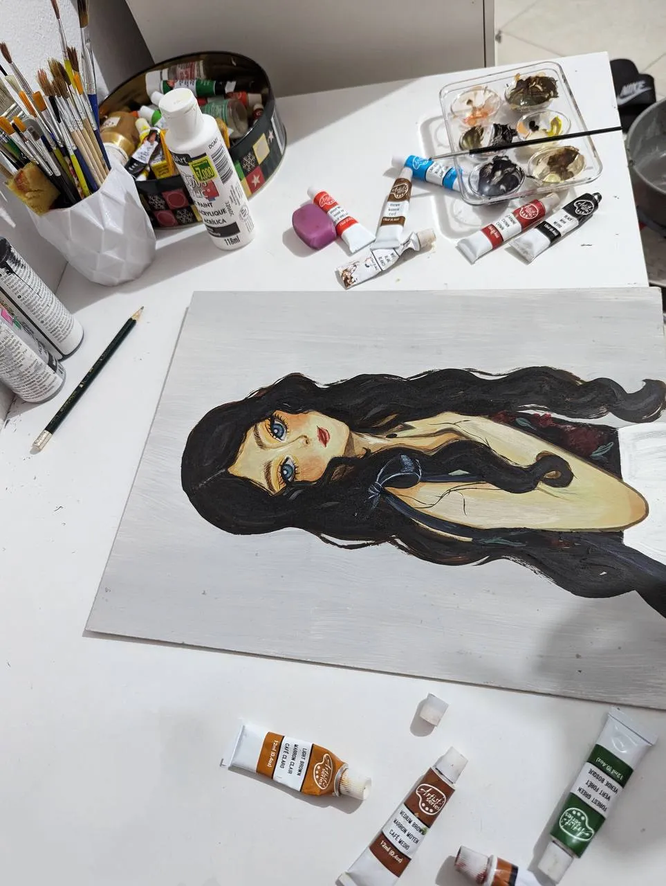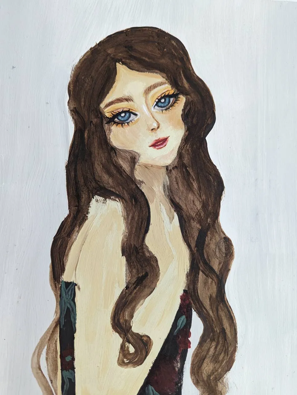 Inspirada en una de mis artistas favoritas: Polnalyubvi. Amo su música y su estética melancólica, introspectiva, delicada y ligeramente oscura. Todo en ella me conmueve profundamente; es una combinación que resuena con mi sensibilidad artística. Esta obra, rodeada de símbolos naturales y ciclos lunares, es una representación del alma sensible y misteriosa que ella evoca.