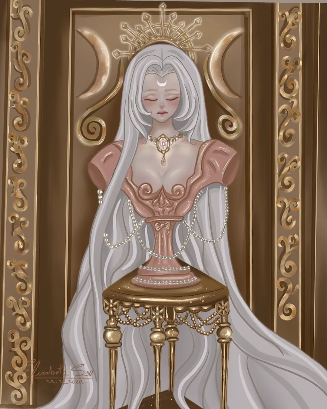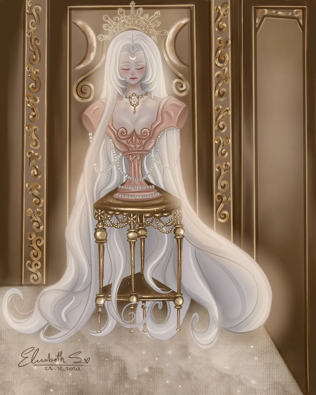 En esta ilustración digital nace una figura suspendida entre lo humano y lo divino. Una diosa dormida, preservada como reliquia viva. Silenciosa, con los ojos cerrados, parece meditar en un plano inalcanzable para el mundo ordinario. Su largo cabello fluye como un río de plata, símbolo de lo eterno y lo sagrado.Habita un espacio íntimo, adornado como un altar, donde el tiempo se ha detenido. No es solo un objeto: es presencia. Una reliquia que aún respira.