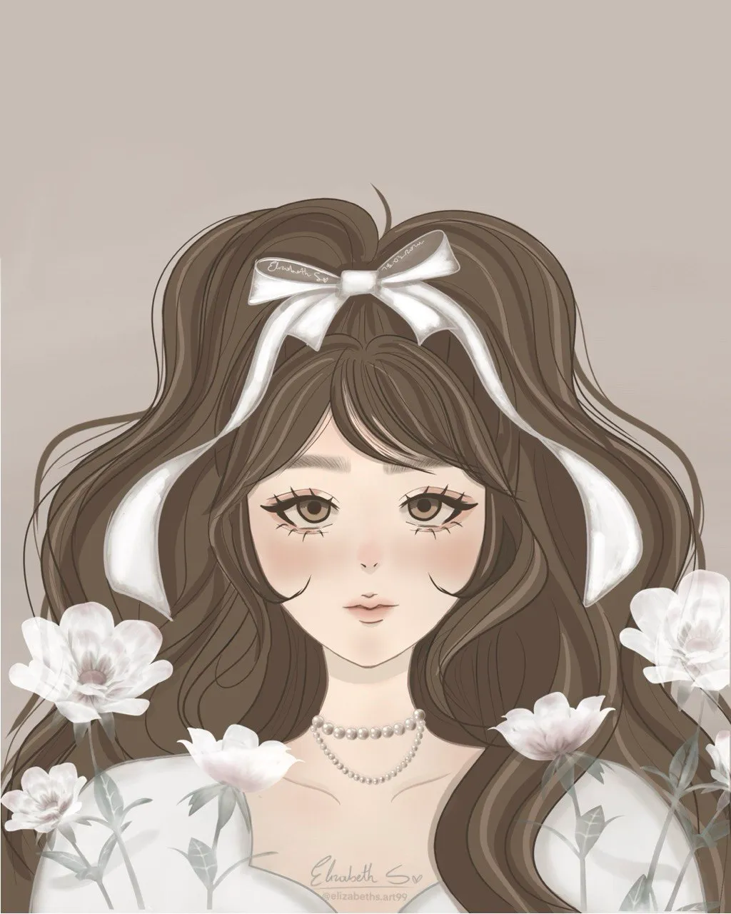 Una pieza digital que refleja la estética romántica, donde cada elemento refuerza la delicadeza y la elegancia visual. Las flores blancas que la rodean aportan un aire poético, fusionando naturaleza y feminidad en una escena serena y encantadora.